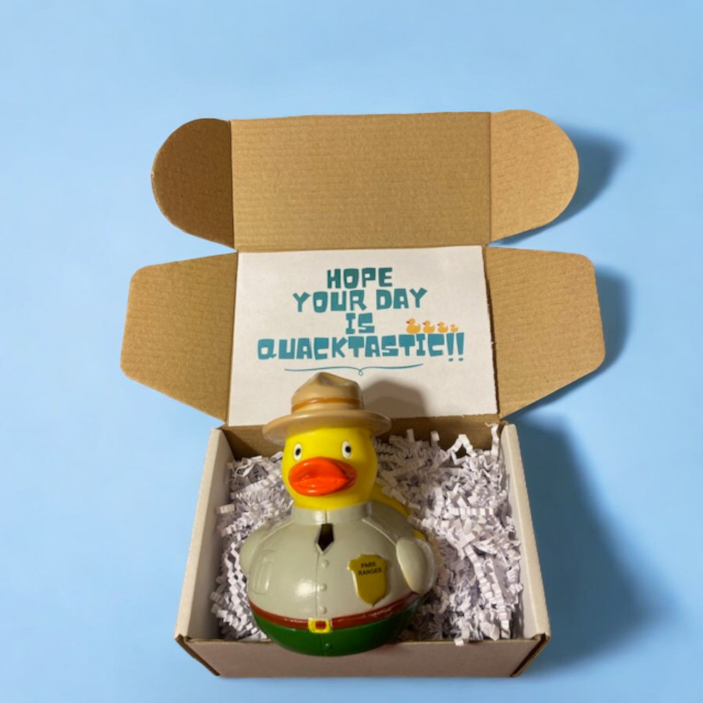 Meet the Park Ranger Rubber Duck – the rubber duck that’s always ready to put out forest fires and spread smiles by keeping us safe! Decked out in a park ranger hat and uniform, this valiant little duck is prepared to patrol the office or your dashboard, ensuring fun and laughter wherever it goes.