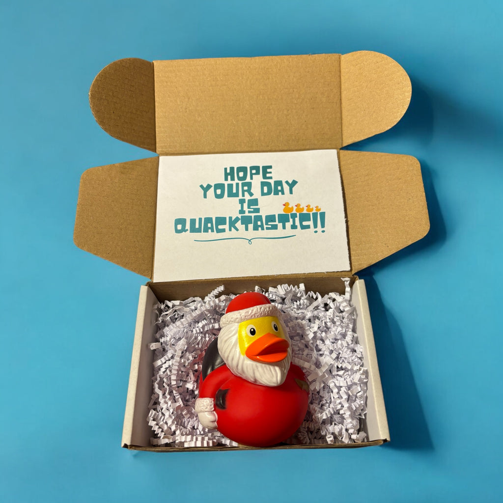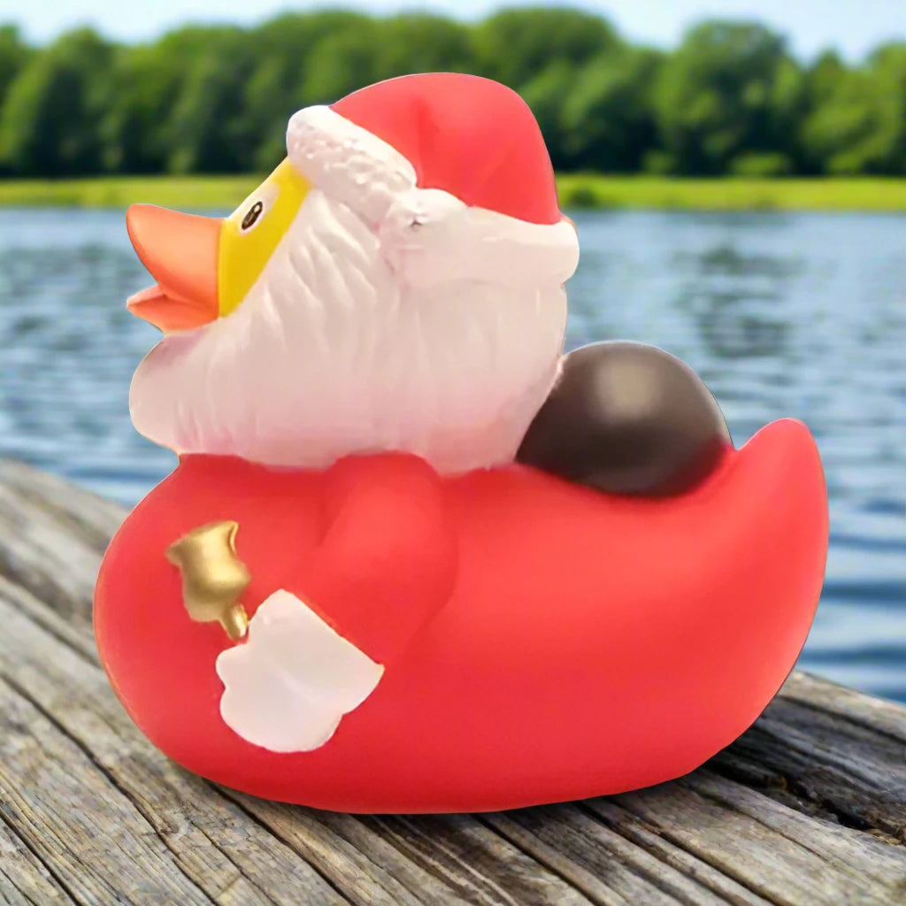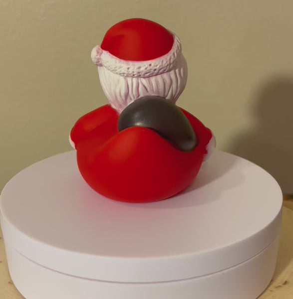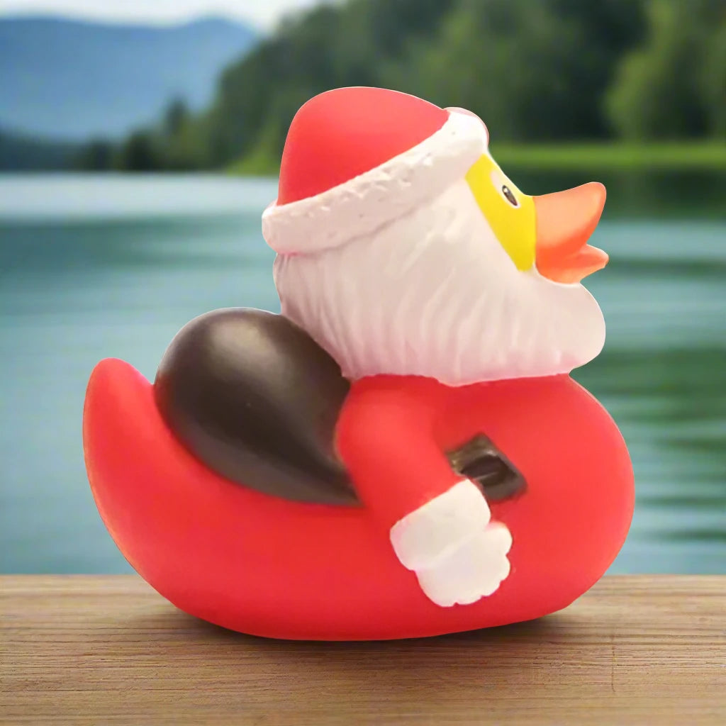 Santa Claus Rubber Duck has a bag full of toys on his back. He's ready to quack "Ho Ho Quack" to all the good boys and girls!
