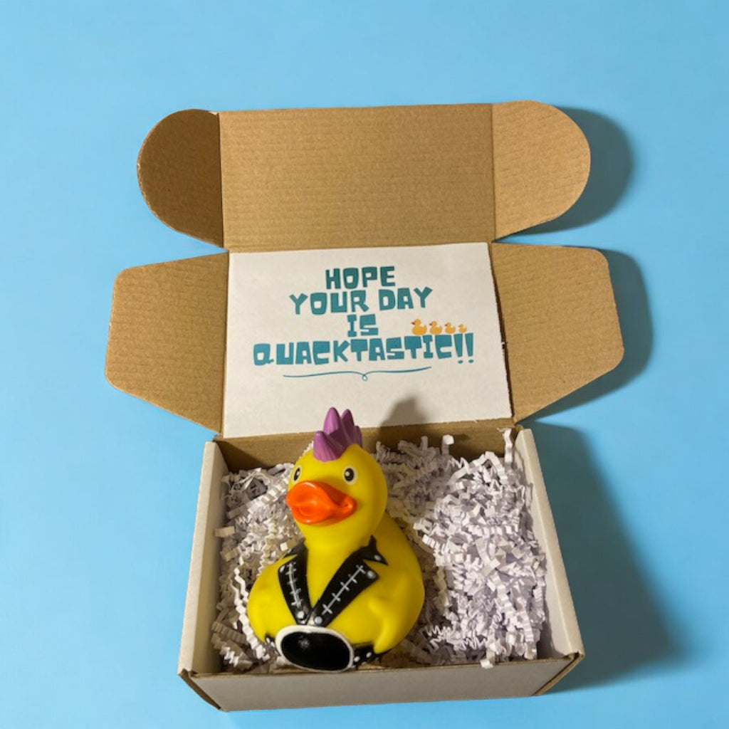 Punk Rock Rubber Duck loves to squeak with Billy Idol! Custom Gift Wrap box Available!Rubber Duck is approximately 3" x 3" x 3.2"Not guaranteed to float upright.Squeak hole? Yes!Comes with a random WISE QUACK note of inspiration and humor!