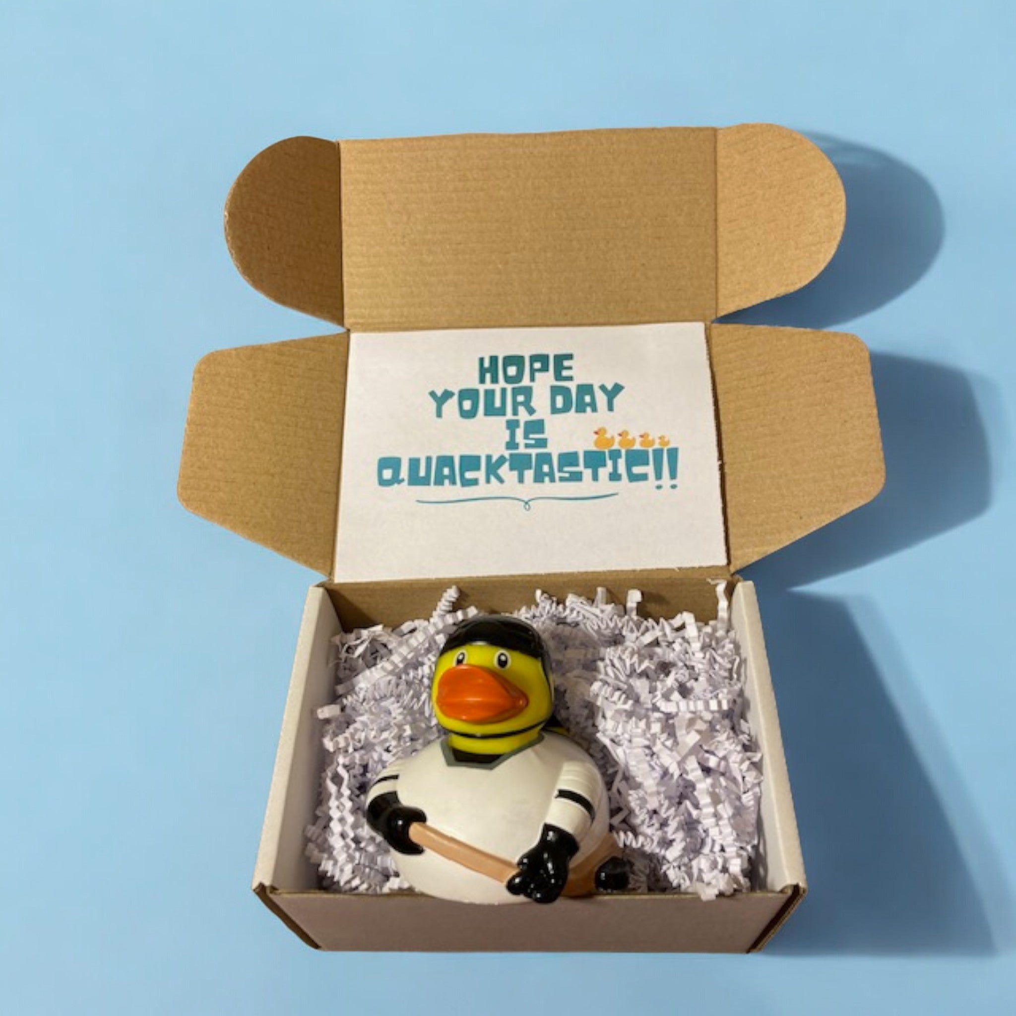 Clear the ice for our Hockey Rubber Duck! Dressed to impress in full hockey gear, complete with a tiny helmet, jersey, and stick, our Hockey Rubber Duck means business. Whether you're gearing up for a nail-biting game or just looking to score some splashes, this duck is your ultimate teammate.