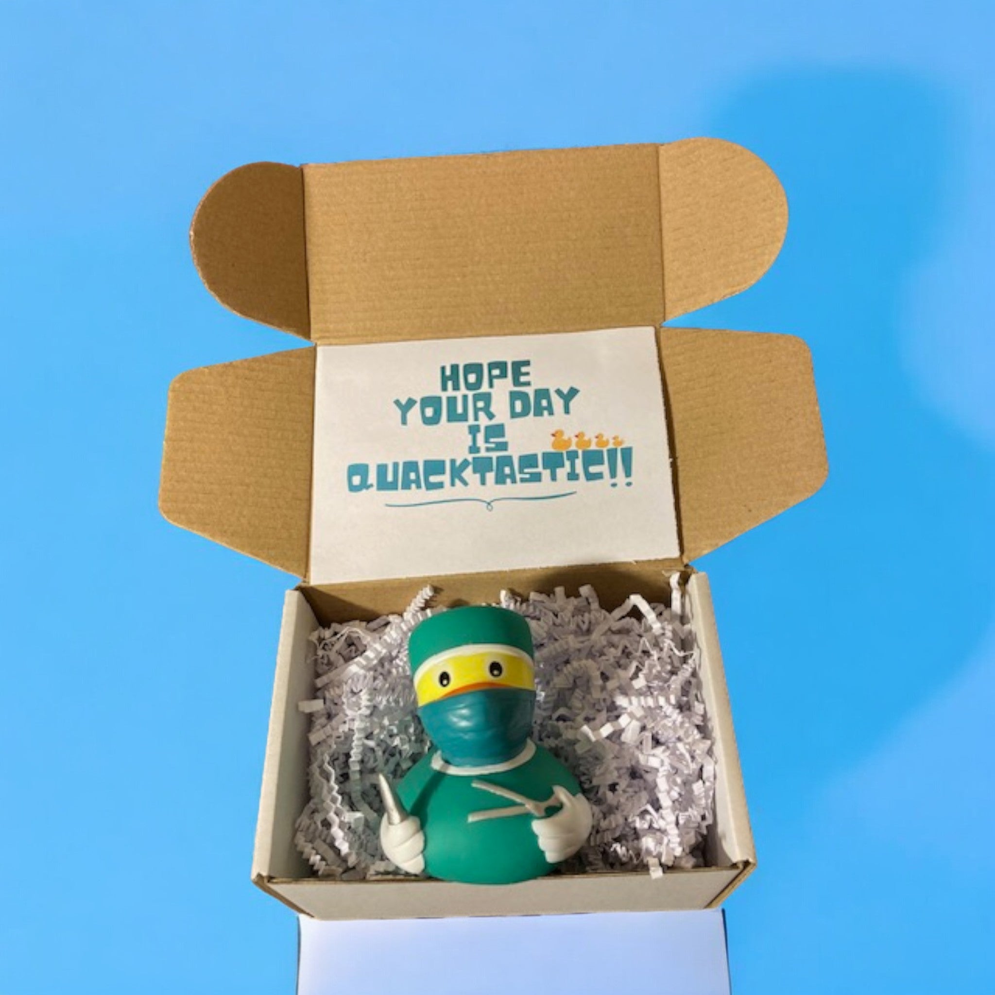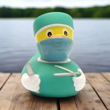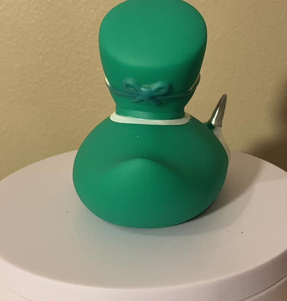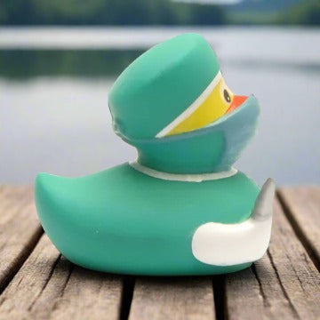 Our awesome Surgeon Rubber Duck has a green surgeon gown, face mask, scalpel and clamp in hand and is ready for surgery!