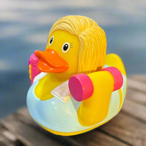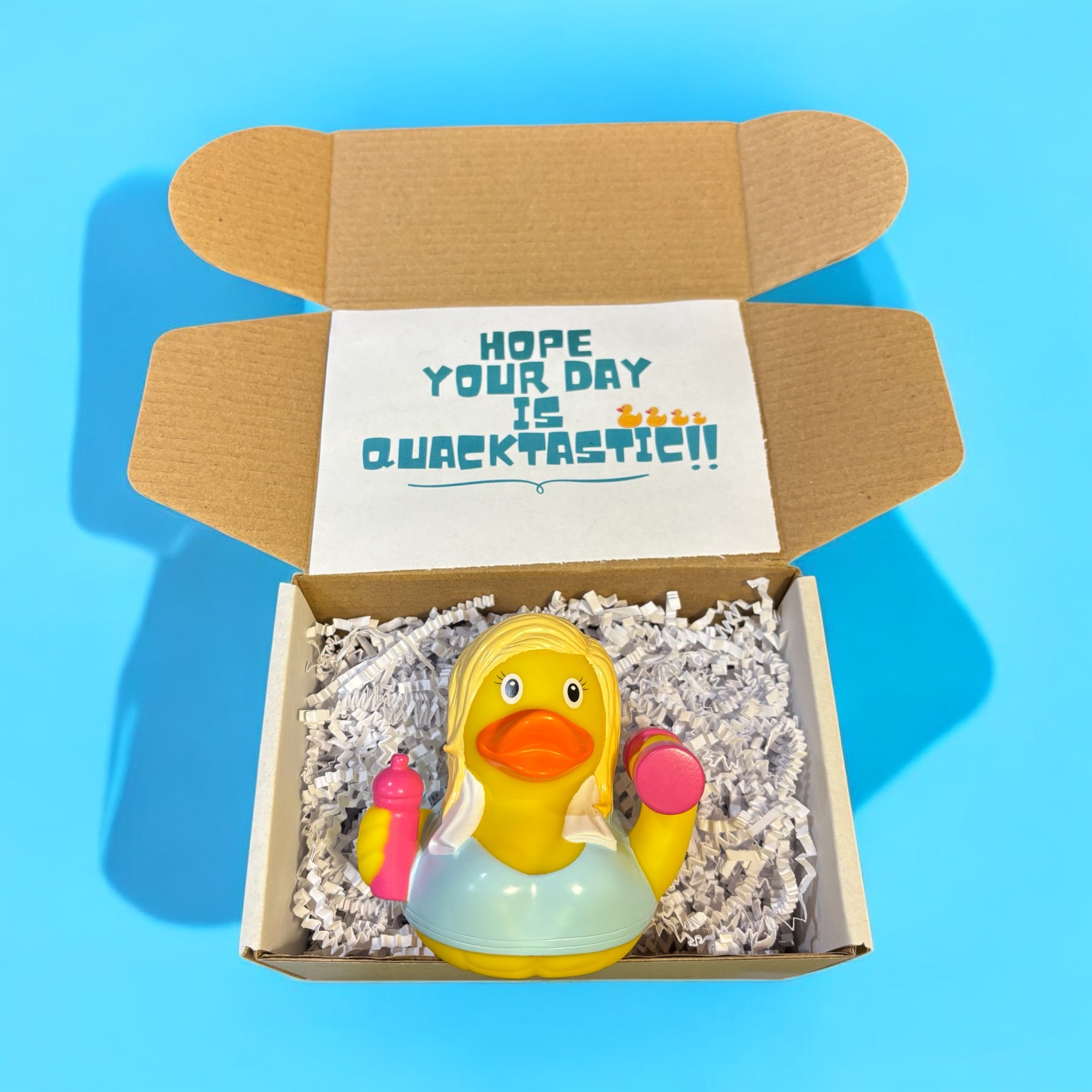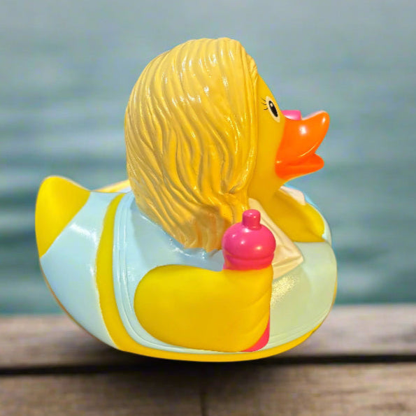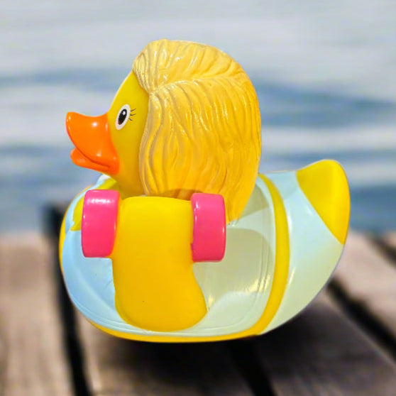 The blonde sporty Fitness Girl Rubber Duck is decked out in a cute sports top and carries a towel, a weight, and a water bottle. She has everything she needs for her workout routine. Perfect for gifting or brightening up your desk, she’s ready to work out and make you smile!