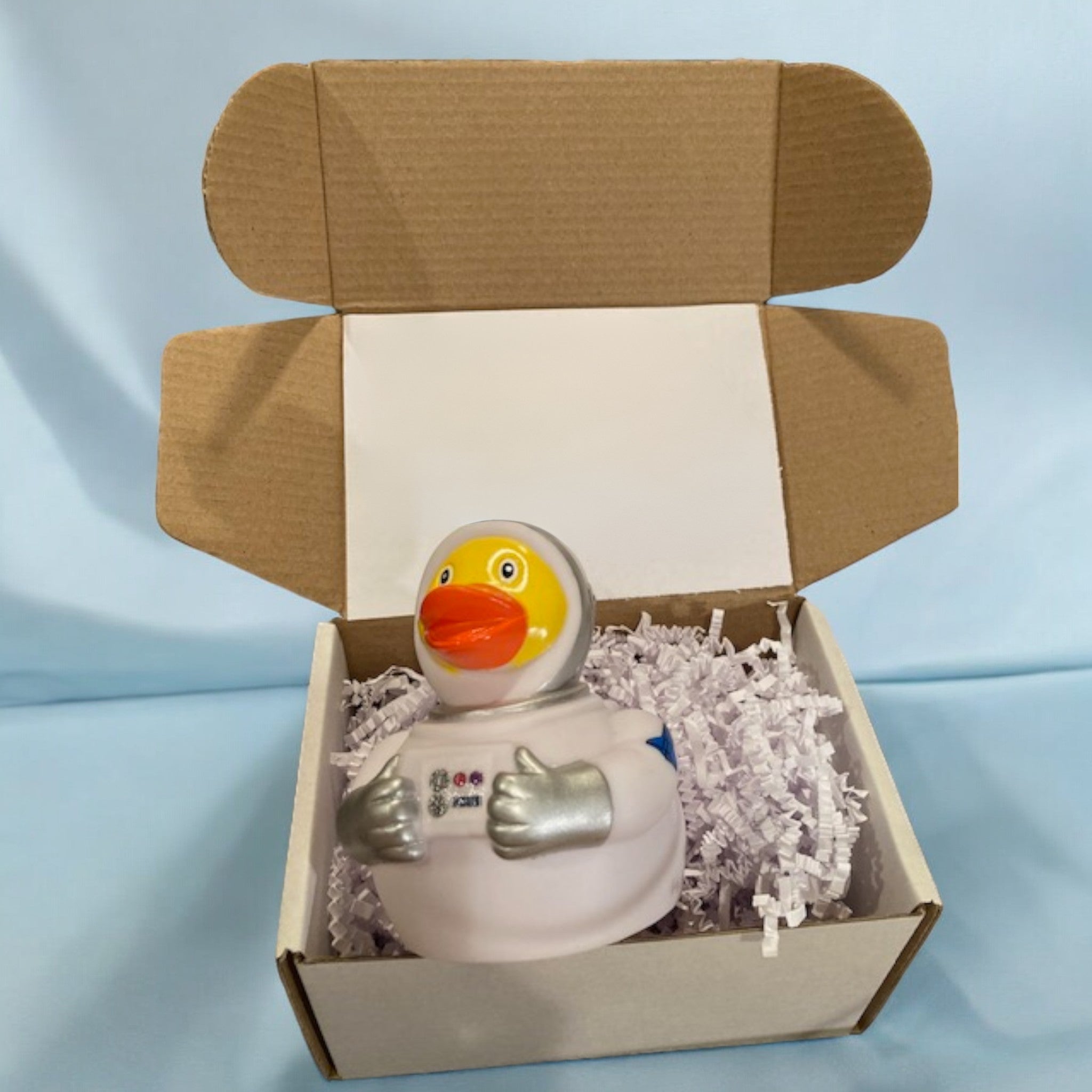 Our Astronaut Rubber Duck is the intrepid explorer who stands ready to embark on a mission of squeaky-clean discovery! Whether perched by your tub for an out-of-this-world session of "duckie space exploration" or adorning your shelf as a playful homage to cosmic conquest, the Astronaut Rubber Duck promises to bring smiles and plenty of intergalactic fun.