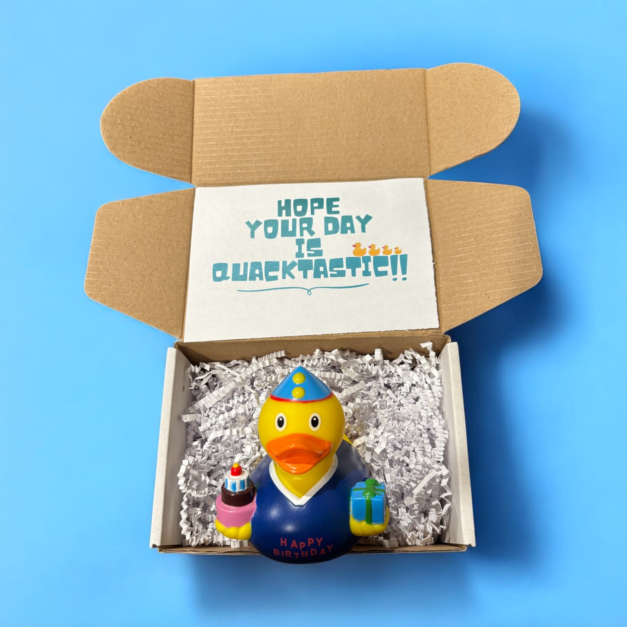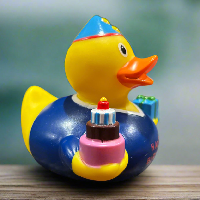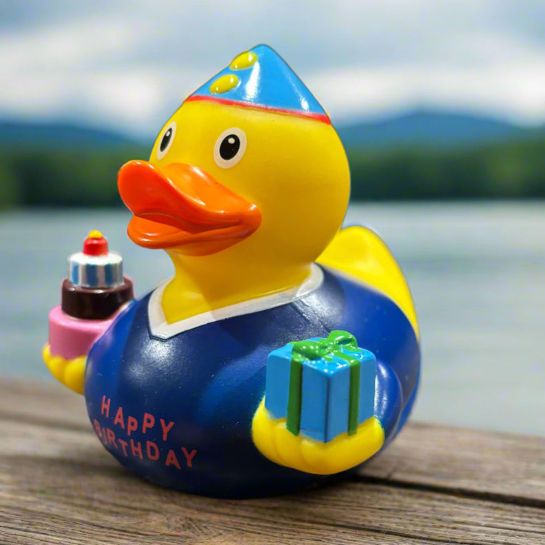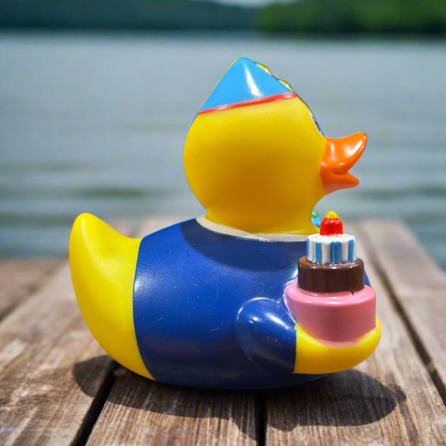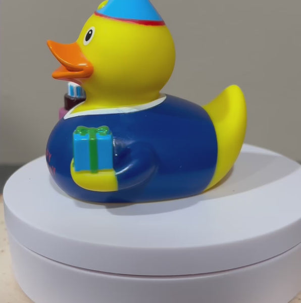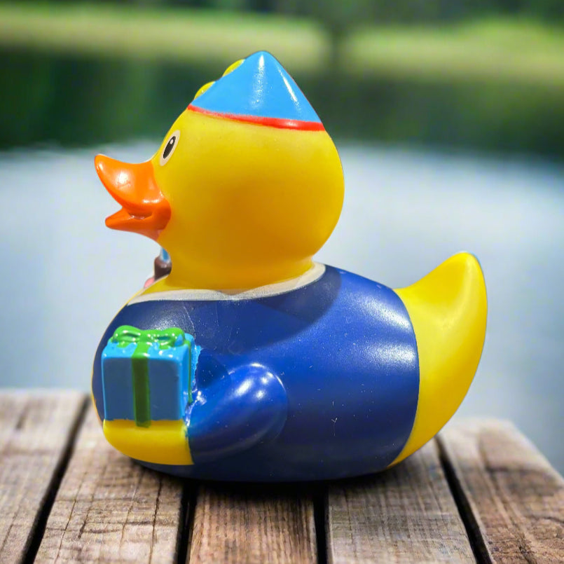 The Birthday Boy Rubber Duck is the perfect surprise for any birthday boy, decked out with a party hat and holding a present in one hand and a birthday cake in the other! Make your gift extra special by including this cheerful Birthday Boy Rubber Duck!