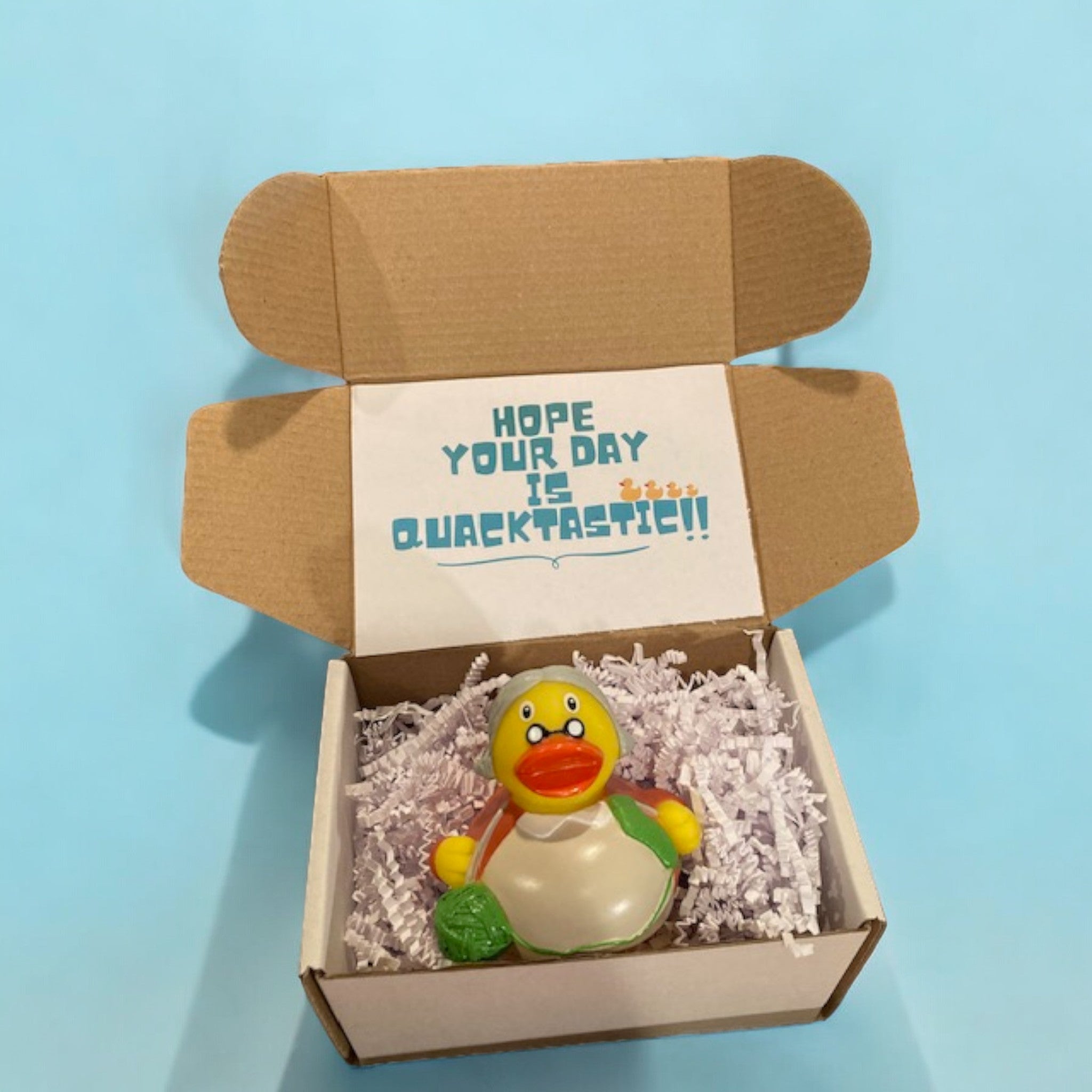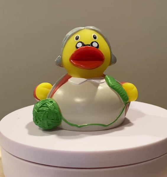Introducing Grandma Rubber Duck - with her cozy sweater, tiny glasses perched just so, and a ball of yarn never far from reach, she is ready to knit her way into your heart, one stitch at a time.