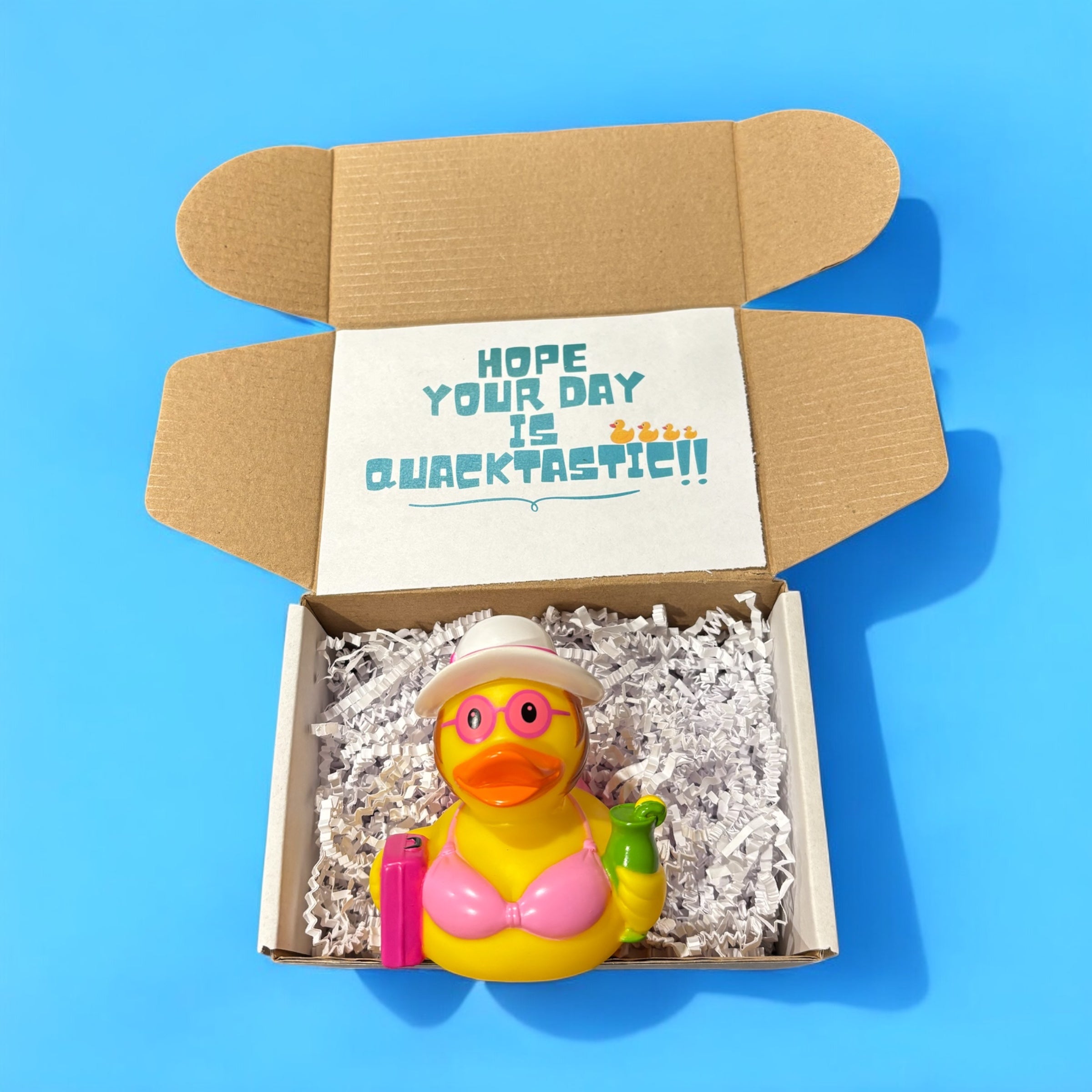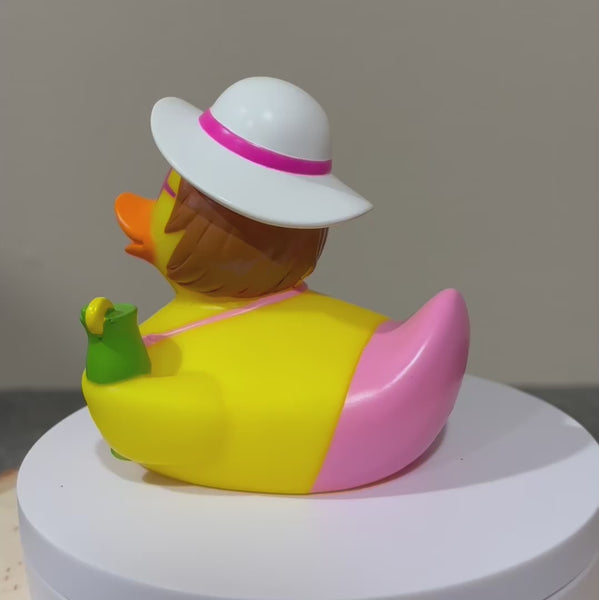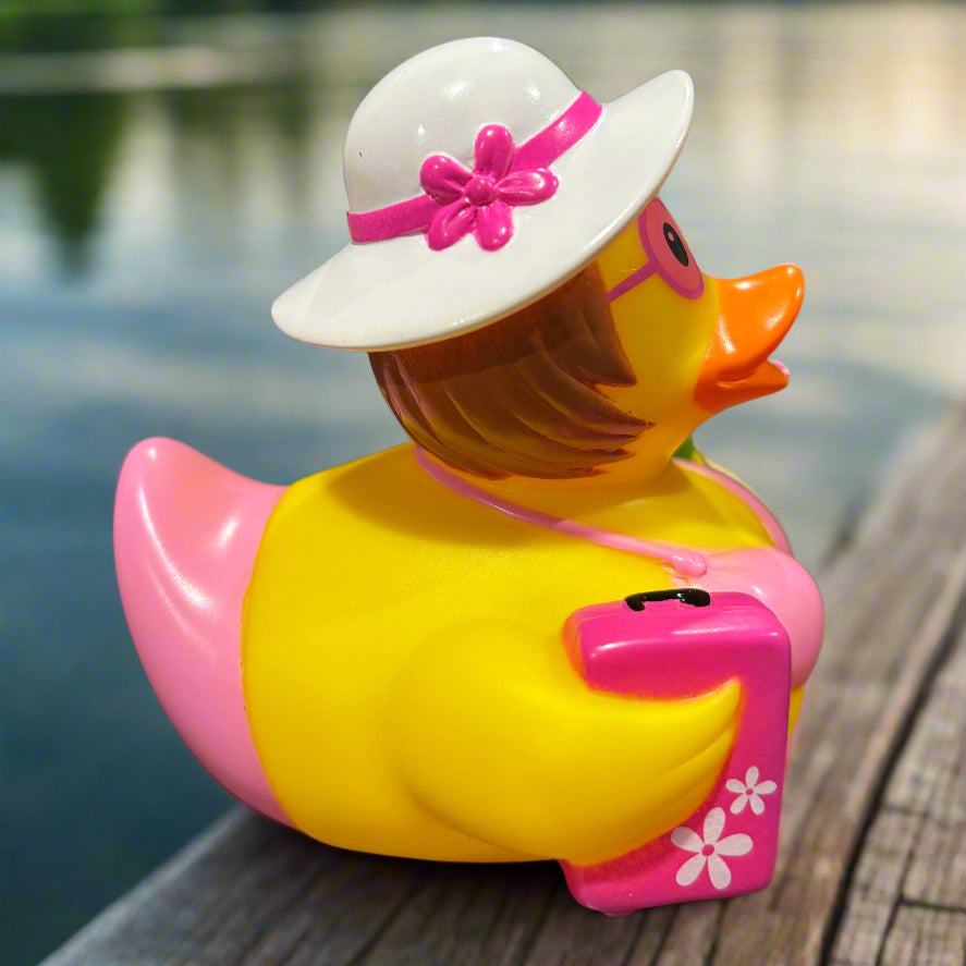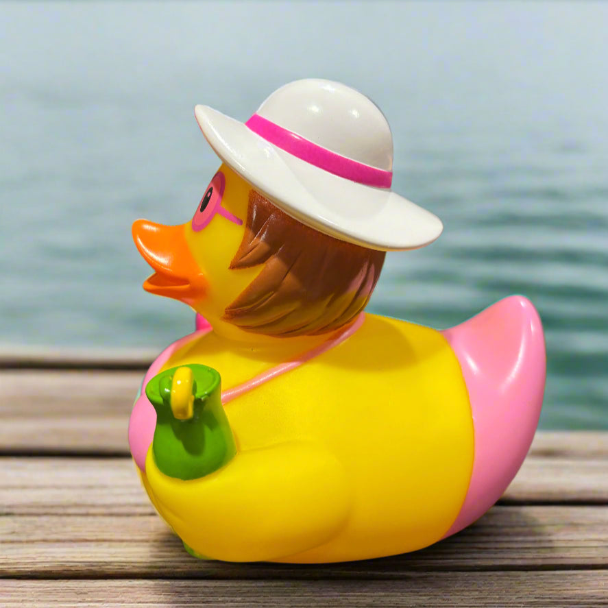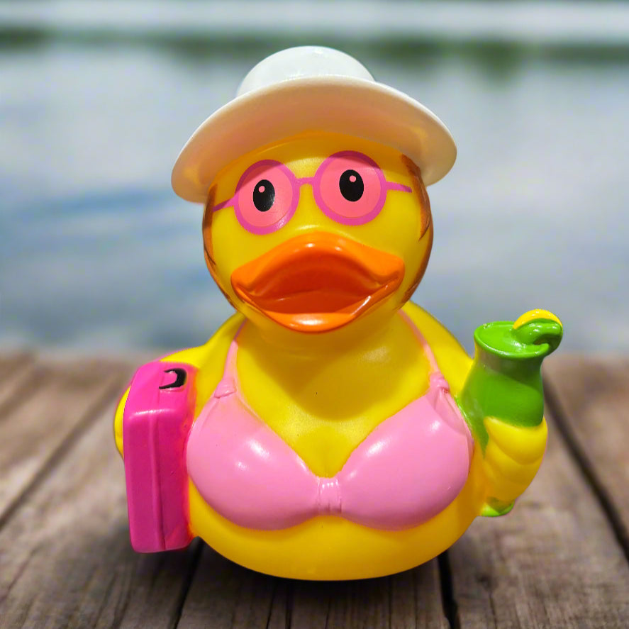 This Beach Vacation Rubber Duck is decked out in a charming pink bikini, holding a refreshing drink in one hand and a suitcase in the other. She's all set to catch some rays and enjoy the sun. An ideal gift for friends who are always dreaming of their next beach getaway!