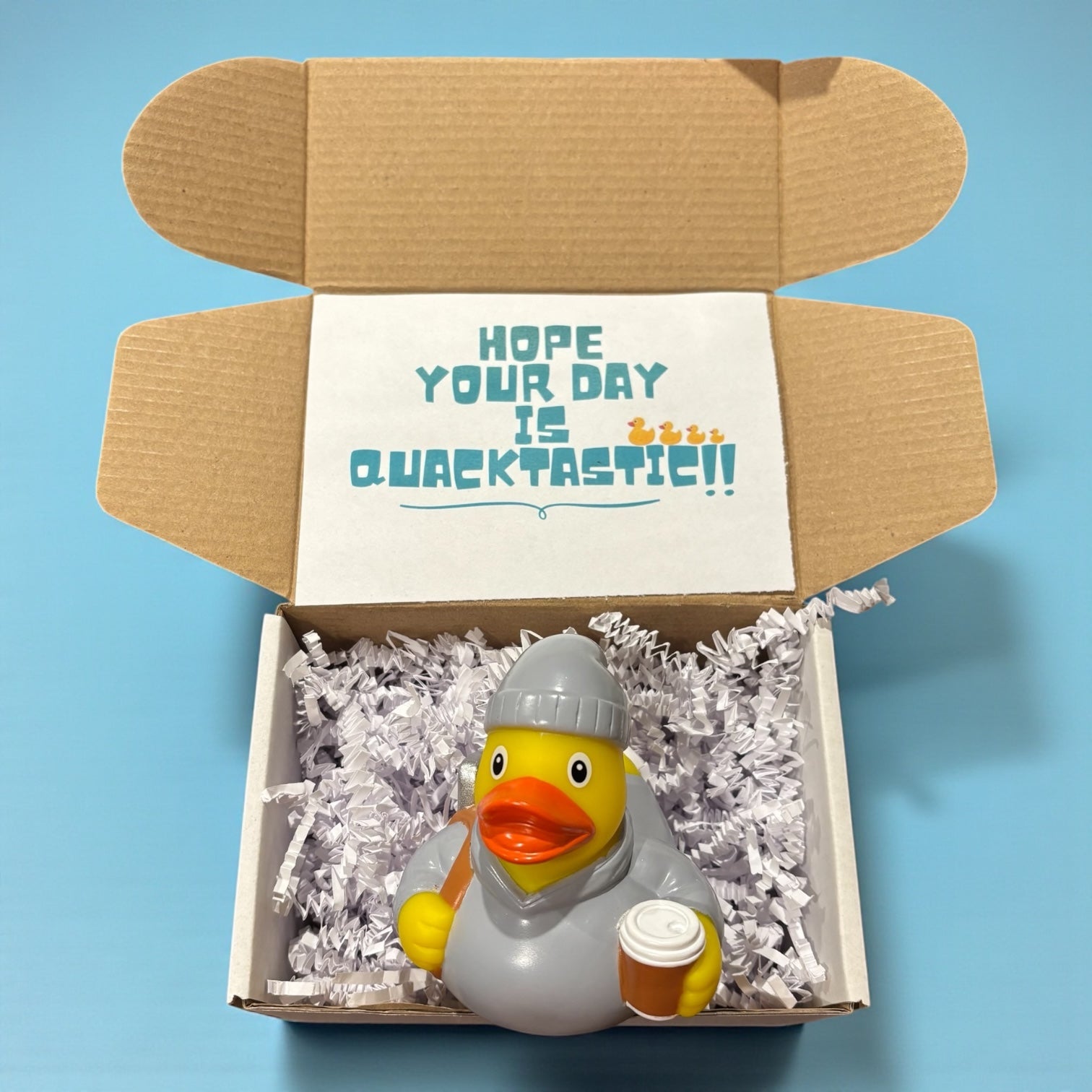 The Morning Coffee Male Rubber Duck totally gets the hustle. Sporting a cozy hoodie, trendy cap, and clutching that essential coffee cup, this quirky duck celebrates the entrepreneurial spirit and creative energy of makers everywhere. It's a playful reminder that innovation and caffeine go hand in hand.