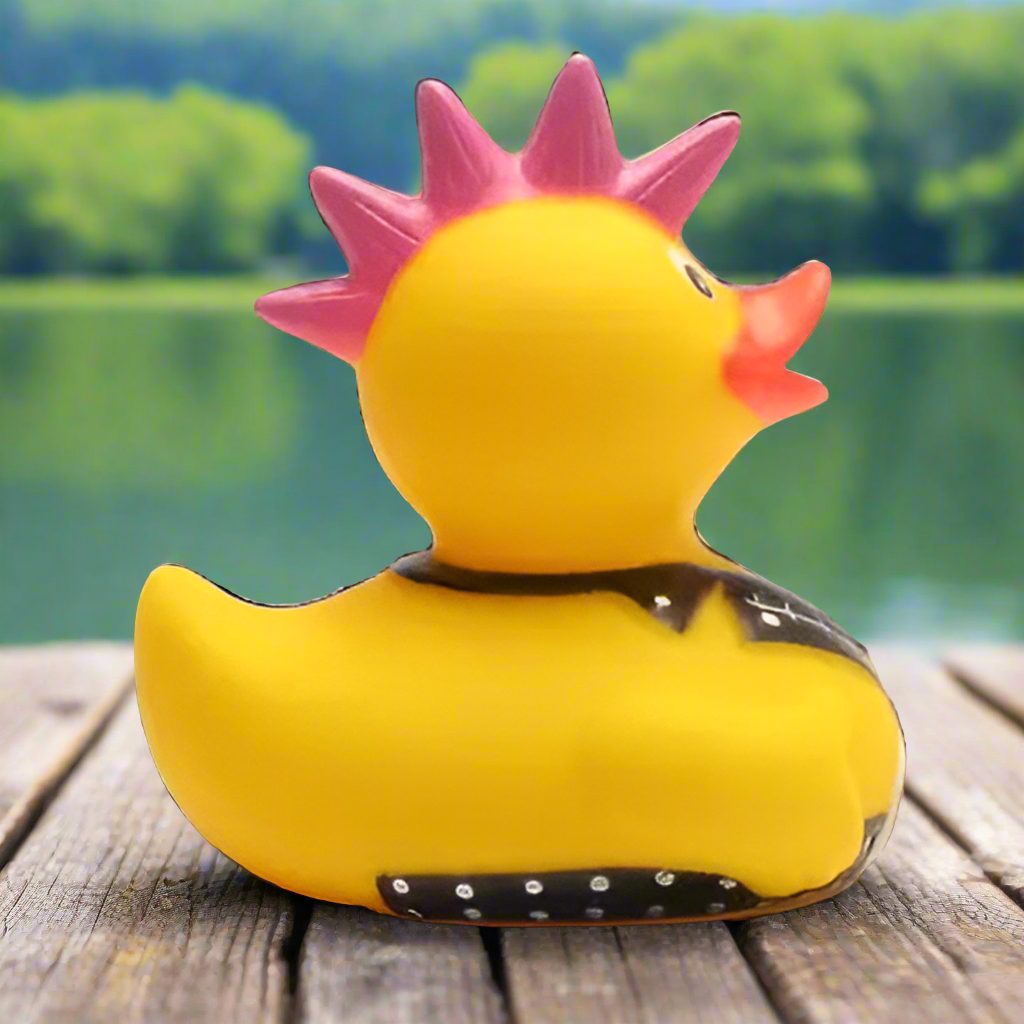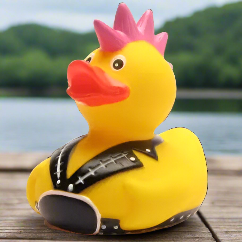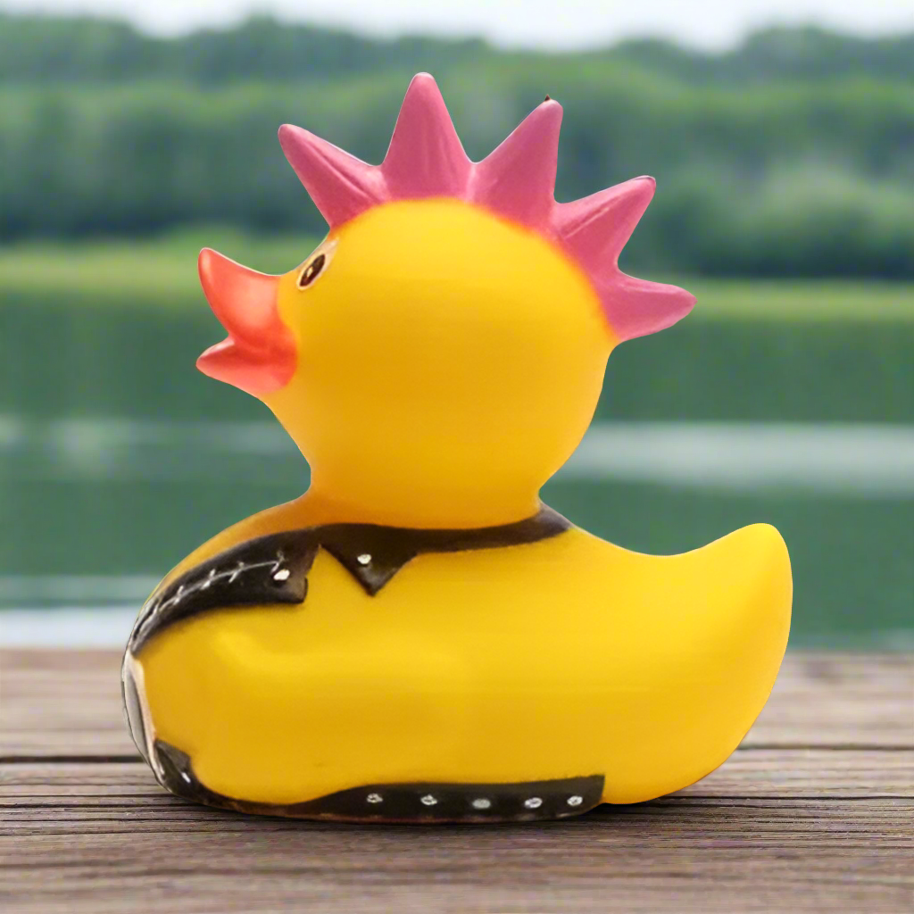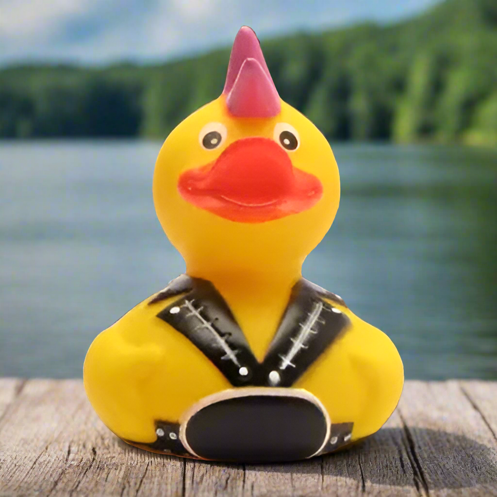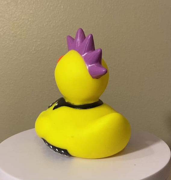 Punk Rock Rubber Duck loves to squeak with Billy Idol! Custom Gift Wrap box Available!Rubber Duck is approximately 3" x 3" x 3.2"Not guaranteed to float upright.Squeak hole? Yes!Comes with a random WISE QUACK note of inspiration and humor!