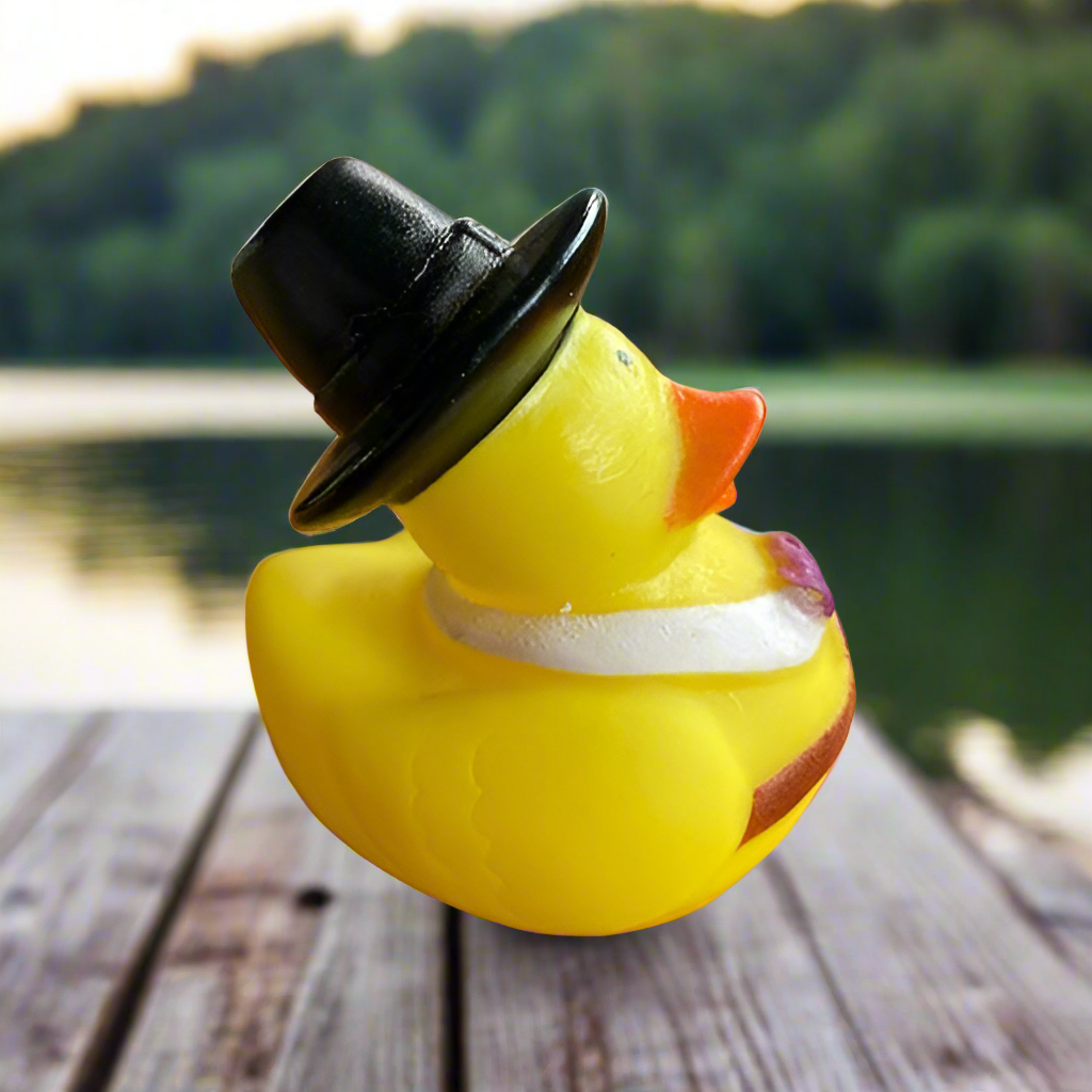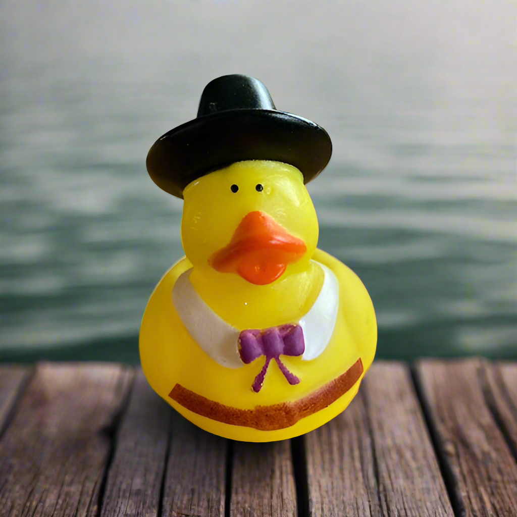 Thanksgiving Pilgrim Man Rubber Duck loves to eat apple pie!
