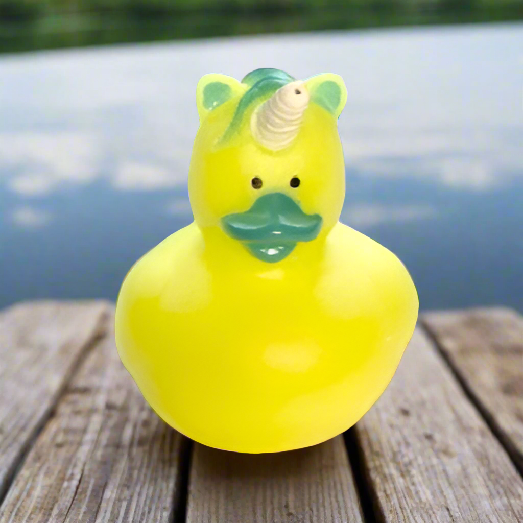 The Unicorn Yellow Blue Rubber Duck loves to hang out with the ponies!