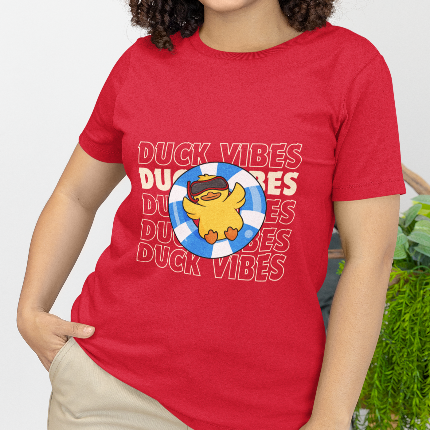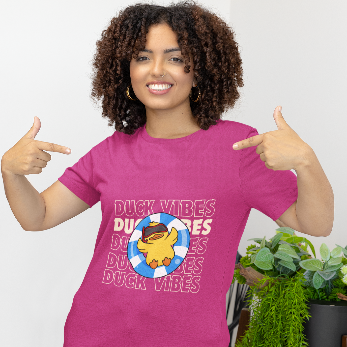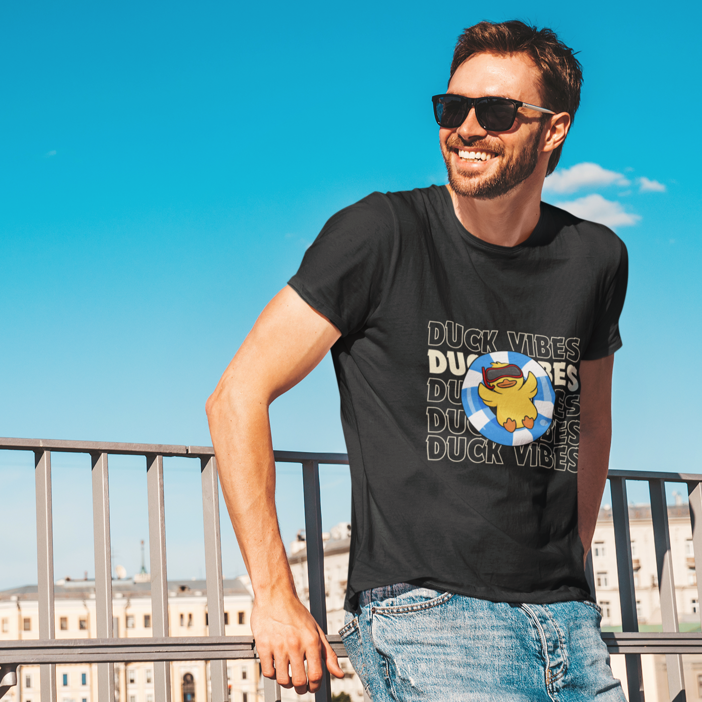 Introducing our "Good Vibes" T-shirt! We know how it feels to look at your closet and see nothing but plain, uninspiring shirts. Life is too short to wear boring clothes that don't make you smile! Don't settle for ordinary. Elevate your style and mood with our "Good Vibes" Rubber Duck T-shirt. Add it to your cart today and start spreading the Good Vibes!